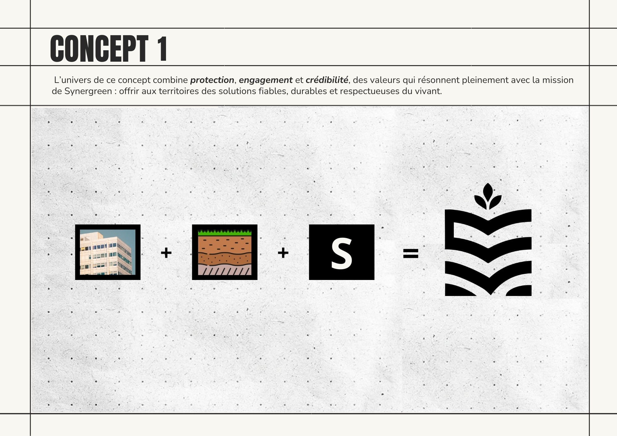 Le concept repose sur la synergie entre urbanisme et nature : Synergreen transforme les espaces urbains en surfaces végétalisées, générant à la fois impact écologique et esthétique. L’identité visuelle traduit cette dualité par des formes simples et modernes qui évoquent la croissance, la durabilité et l’harmonie entre architecture et environnement.